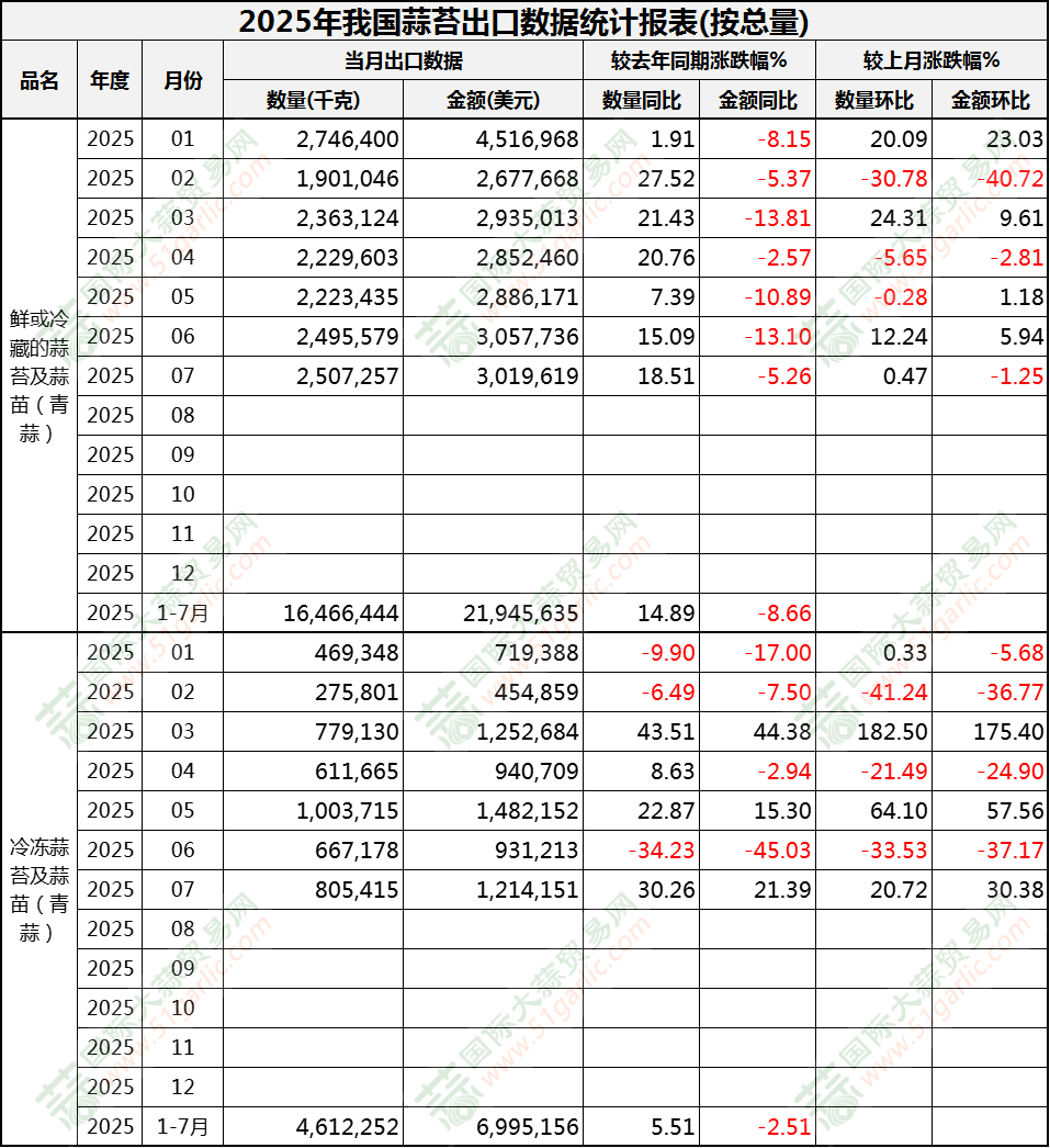 2025年7月蒜苔出口數(shù)據(jù)(按總量)