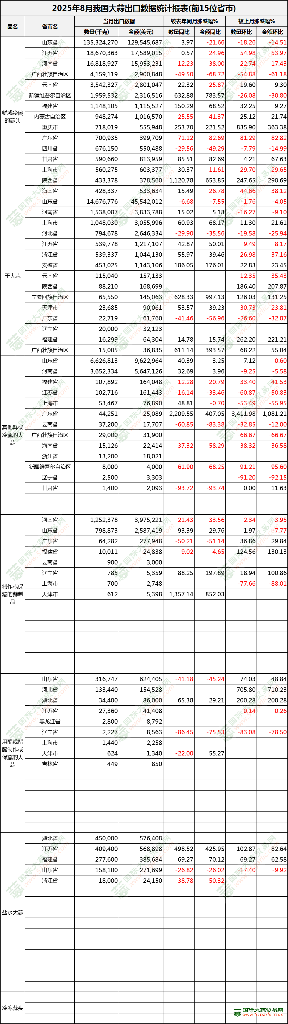 2025年8月大蒜出口數(shù)據(jù)(按省市)