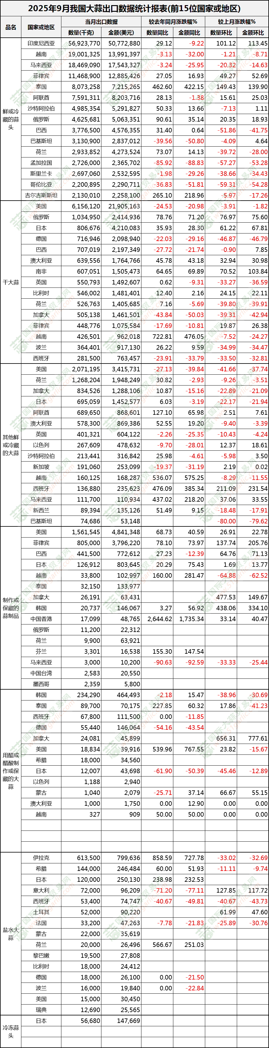 2025年9月大蒜出口數(shù)據(jù)(按國(guó)家)