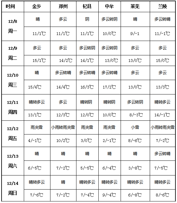 12月8日-14 日大蒜主產(chǎn)區(qū)天氣先暖后寒,前半周(12月8-10日)以晴、多云為主,氣溫在0-17℃;后半周(11-14日)氣溫驟降,最低溫跌至-8℃,12日多地出現(xiàn)雨夾雪、小雪等降水天氣。