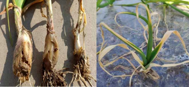 大蒜根腐病是由腐霉、疫霉、鐮刀菌等多種真菌病原引起的土傳性病害,發(fā)病初期病菌由根尖向根盤蔓延,病部黃褐色后期腐爛,并有腥臭味,易引發(fā)蒜蛆及其它寄生性害蟲;地上部蒜苗不長、葉片干尖黃化,隨著病菌的擴(kuò)散,危害逐步加重,甚至爛根枯苗死亡,嚴(yán)重影響大蒜產(chǎn)量和品質(zhì)。