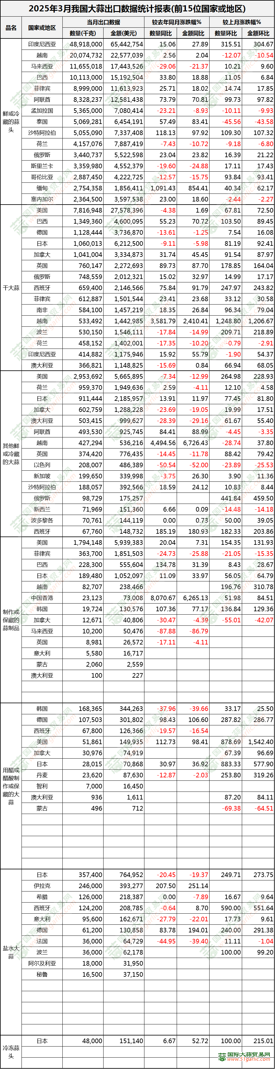 2025年3月大蒜出口數(shù)據(jù)(按國(guó)家)