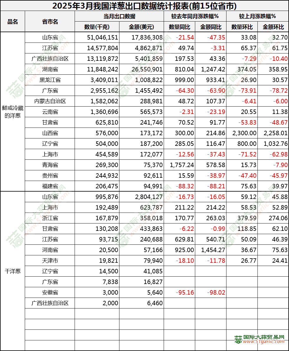 2025年3月洋蔥出口數(shù)據(jù)(按省市)