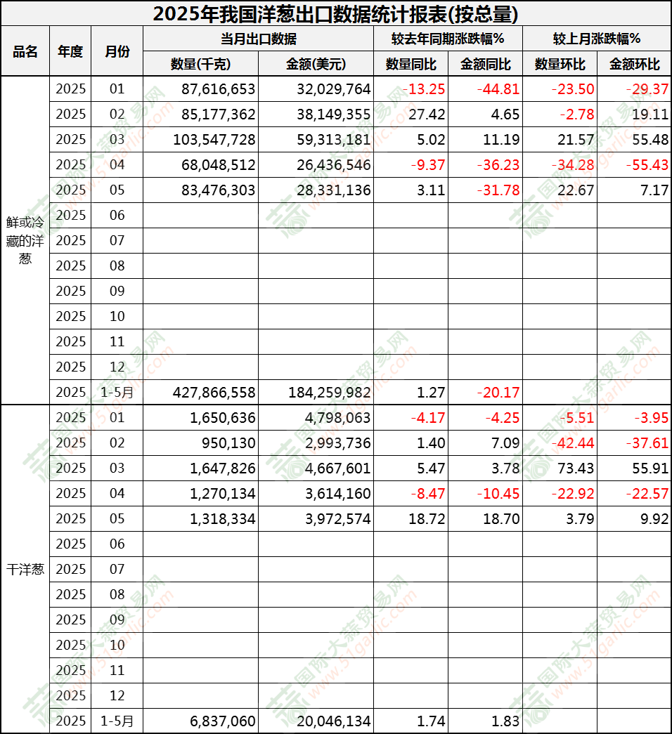 2025年5月洋蔥出口數(shù)據(jù)(按總量)