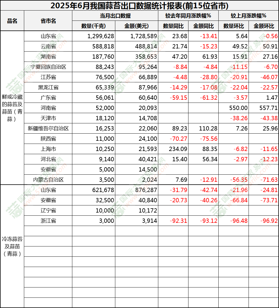 2025年6月蒜苔出口數(shù)據(jù)(按省市)