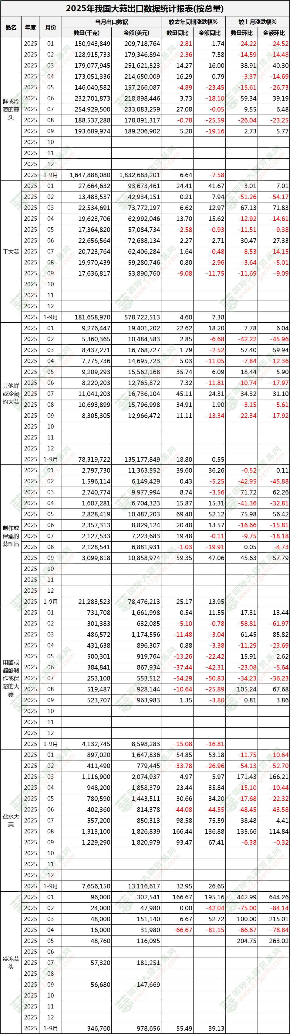 2025年9月大蒜出口數(shù)據(jù)(按總量)