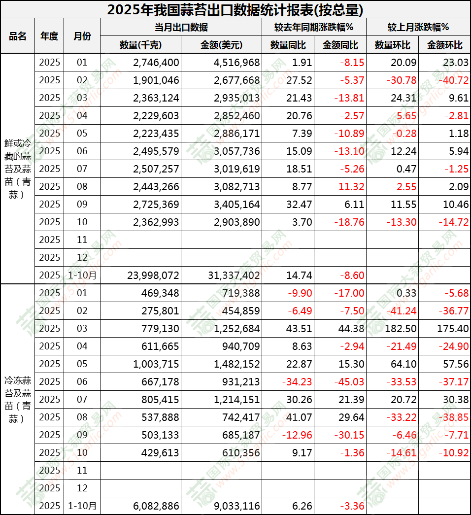 2025年10月蒜苔出口數(shù)據(jù)(按總量)