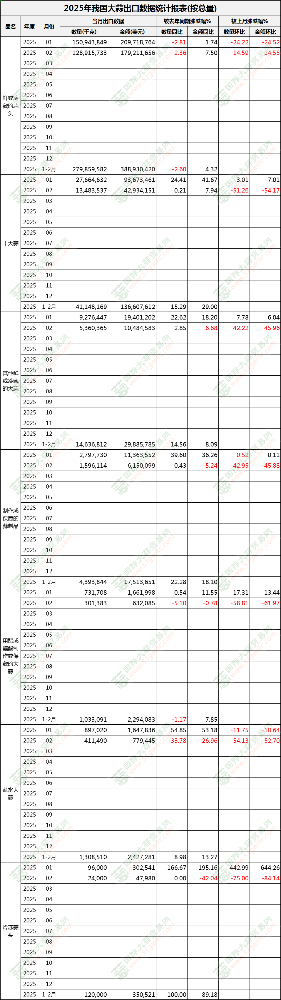 2025年1-2月大蒜出口數(shù)據(jù)(按總量)