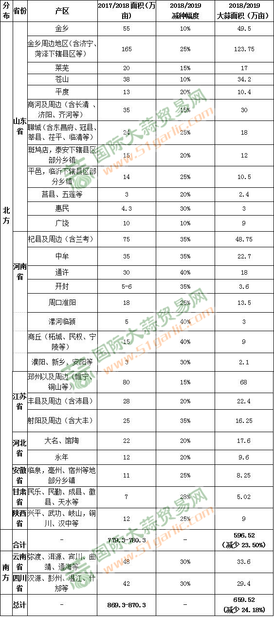 2018-2019年度全國大蒜種植面積統(tǒng)計(jì)