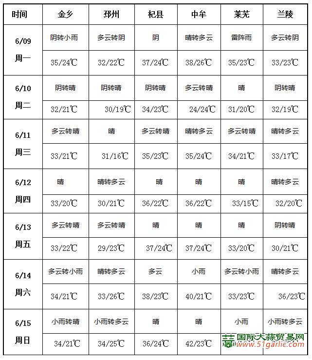 本周北方大蒜產(chǎn)區(qū)降雨頻繁,6月9日金鄉(xiāng)、萊蕪產(chǎn)區(qū)有小雨或雷陣雨,6月14-15日,降雨范圍進(jìn)一步擴(kuò)大,大蒜產(chǎn)區(qū)降雨連連,并可能伴有強(qiáng)對(duì)流天氣。然而,降雨并未帶來(lái)涼爽天氣,本周產(chǎn)區(qū)整體氣溫偏高,部分地區(qū)甚至出現(xiàn)了40℃以上的高溫天氣。其中,金鄉(xiāng)產(chǎn)區(qū)的最高氣溫達(dá)到35℃,最低氣溫為20℃。當(dāng)前,北方主產(chǎn)區(qū)的大蒜采收工作已經(jīng)完成,家家戶戶的房前屋后都堆滿了正在晾曬的大蒜。在此期間,蒜農(nóng)和蒜商需密切留意天氣變化,積極做好大蒜的防雨晾曬工作,以保障大蒜的品質(zhì)不受影響。